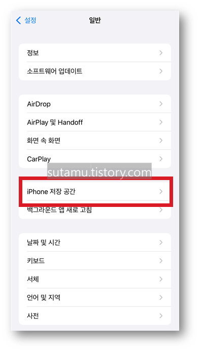 1. 설정에서 일반 > iPhone 저장 공간으로 우선 이동합니다.
