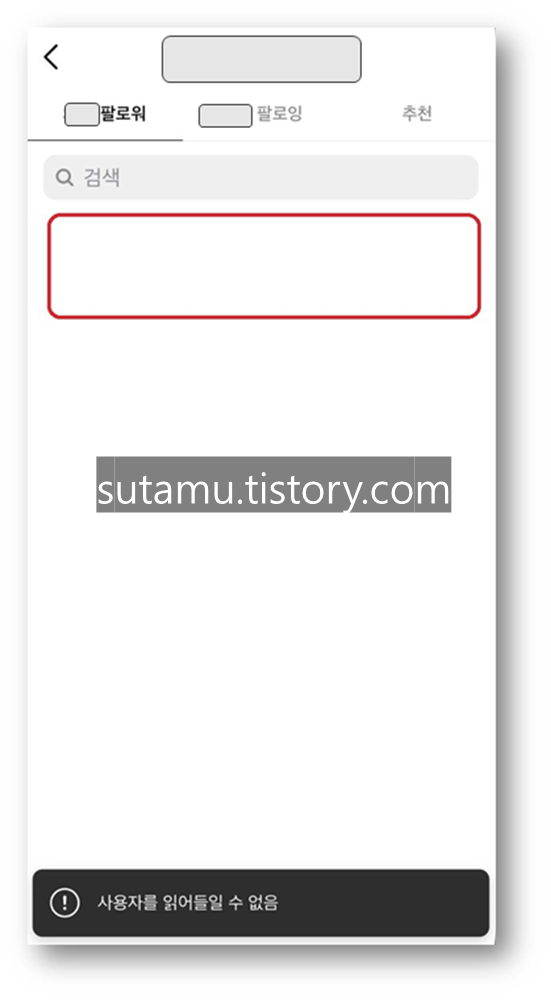게다가 아래와 같이 팔로워를 눌러서 확인하려고 해도 아무것도 없이 빈 화면만 나타난다. 결국 차단을 당하면 "사용자를 찾을 수 없음" 이라고 나타나며 상대의 프로필 사진만 보일 뿐 게시물과 팔로워 팔로잉은 뜨지 않는다.