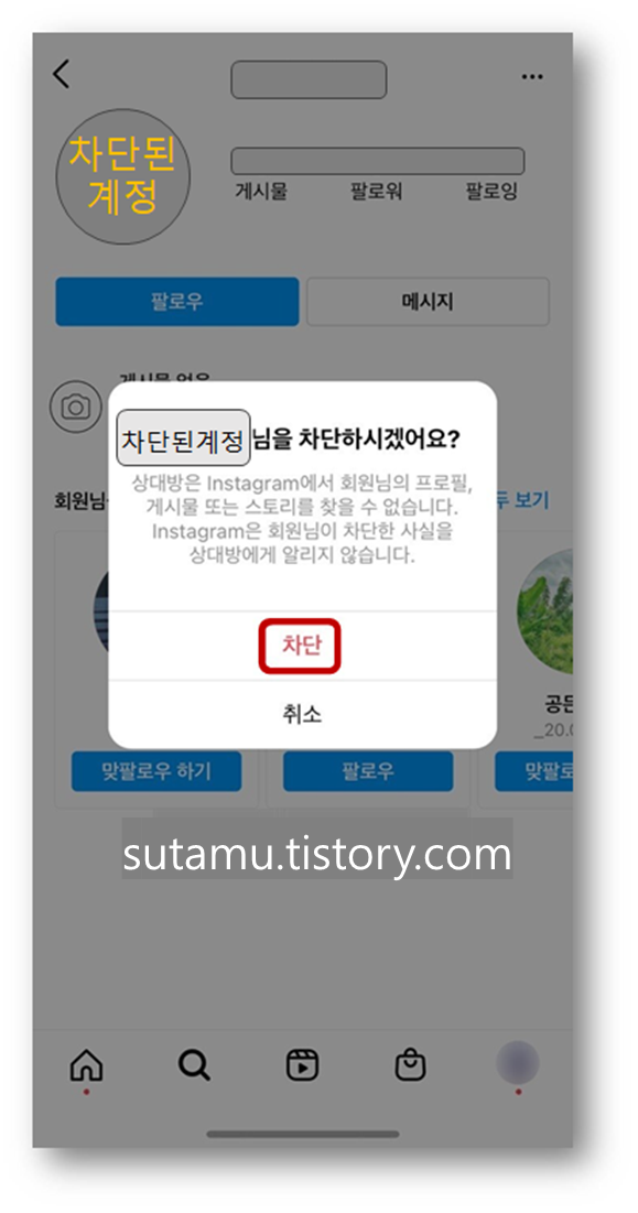 그러면 아래와 같이 "차단된 계정"님을 차단하시겠어요? 라는 팝업이 나타나면 "차단" 항목을 눌러주면 된다.