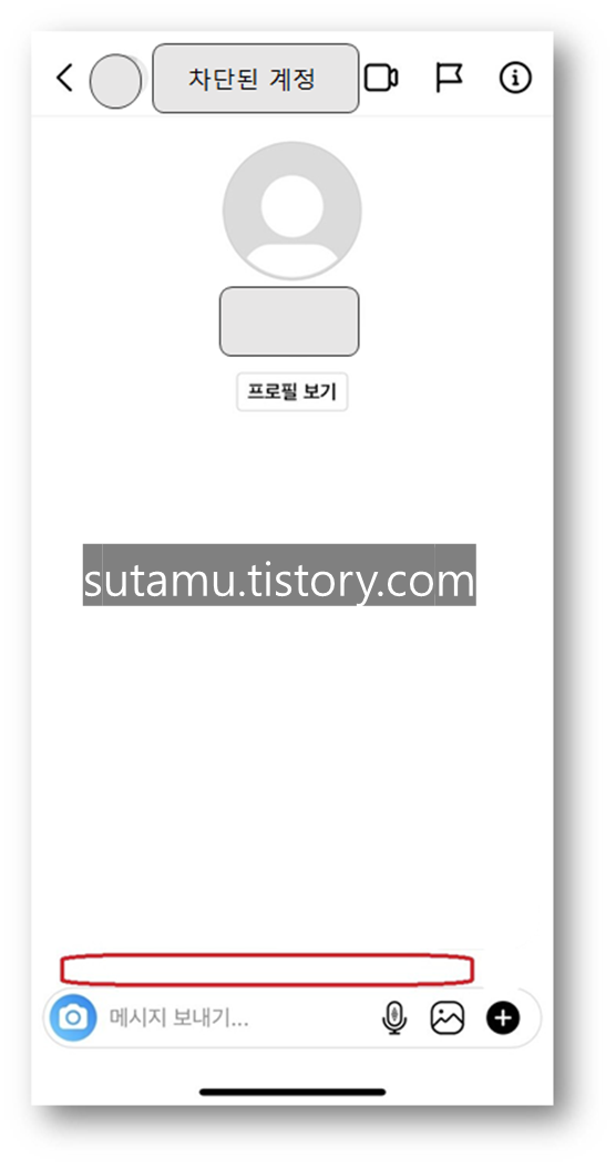 디엠 창을 통해 프로필 접속한 다음 "차단 진행 계정"으로 들어가보았다. 검색을 해도 계정이 자체가 나타나지 않기 때문에 차단을 진행한 계정과의 디엠 창을 통해서 차단 진행한 계정의 프로필로 접속해보았다.