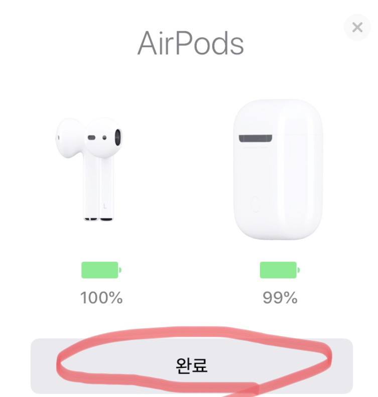 (6) 마지막으로 아래와 같이 "완료" 버튼이 활성화되면 에어팟과 정상적인 연결이 성공된 것이다.